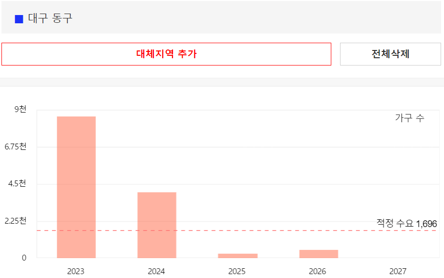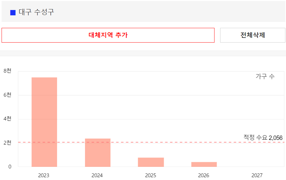 위의 그림에서 빨간점선은 대구에 필요한 적정 아파트 수량을 나타내며, 대구의 아파트 적정 수요는 매년 1만 2천세대 정도입니다. 하지만 23년에만 적정 수요의 3배에 육박하는 3만 4천세대가 입주할 예정이고, 24년에는 2만 1천세대 입주 예정, 25년에 들어서야 적정물량 미만인 1만세대정도로 줄어들게 됩니다.
