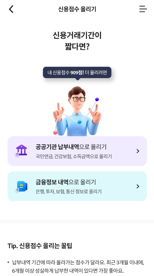 나이스 지키미 신용점수 올리기에서는 공공기관 납부내역과 금융정보 내역으로 신용점수를 올릴 수 있는 방법을 제공하고 있습니다. 국세청에서 확인할 수 있는 소득금액이나 건강보험&국민연금 납부증명서를 연계하여 신용점수를 올릴 수 있습니다.