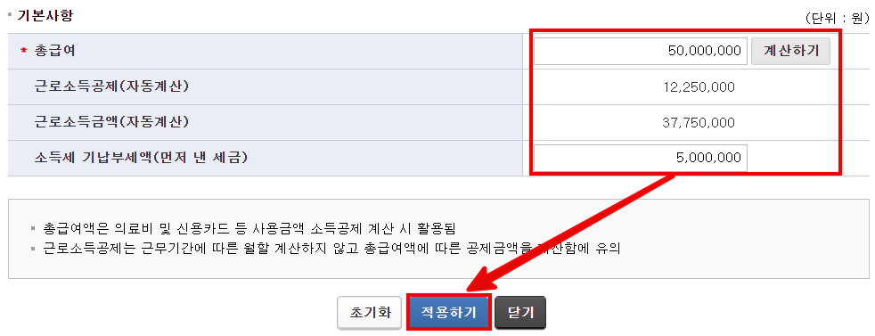 근로소득 원천징수부에서 확인한 연간소득액과 기납부세액 정보를 기입합니다. 근로소득공제와 근로소득금액은 자동으로 계산되어 기입됩니다.