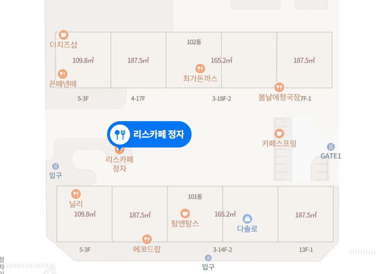 정자동 동양파라곤 1단지에 위치하고 있습니다. 아래 지도 사진처럼 대로변이 아닌 단지의 상가 골목에 위치하고 있다는 점을 참고하시고 찾아가시면 됩니다. 찾기 어렵지 않아요 :)