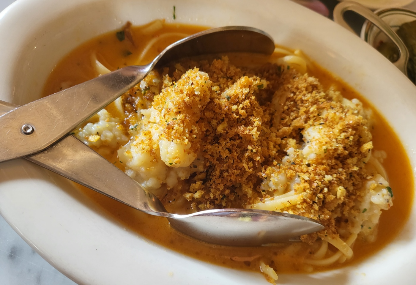 샌프란 스타일 갈릭 누들에는 갑오징어가 들어있는데 정말 부드럽고 질기지 않아서 오징어가 맞나 싶을 정도였어요. 넉넉하게 들어있어요. 근데 오일베이스 국물이 다소 짜더라고요. 마늘플레이크를 섞으니 조금 더 짜진 느낌! 친구랑 저랑 둘 다 그렇게 특별한 맛은 아니다 얘기했어요. 국물에 바게트빵 찍어먹는 것 추천!