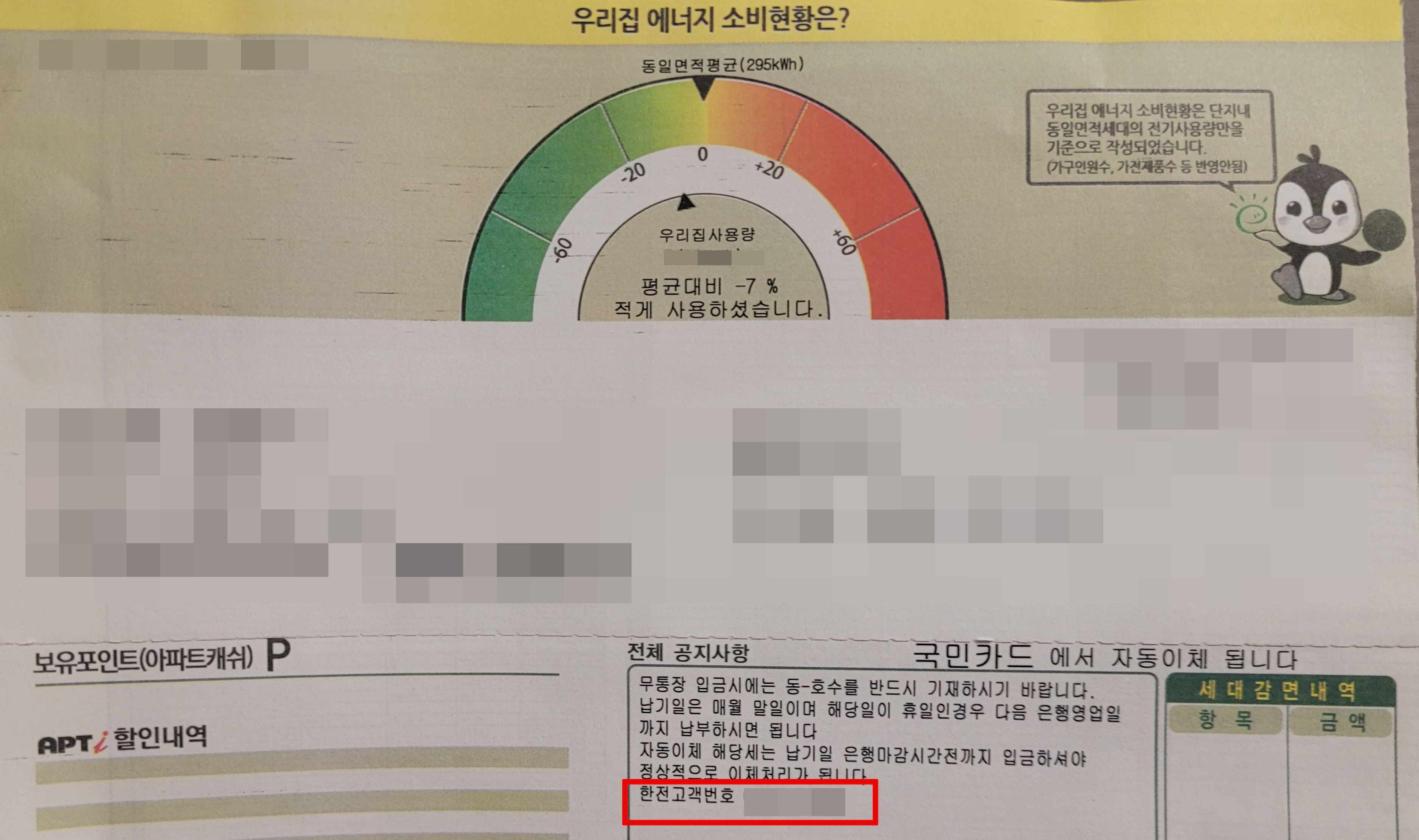 고압아파트의 고객번호를 확인하는 방법은 관리비 명세서를 보시면 한전고객번호를 확인할 수 있습니다. 관리비 명세서를 보시면 전체공지사항이 있고, 해당 부분에 한전고객번호가 기재되어 있습니다. 해당 번호는 개인별로 부과되는 게 아니라 아파트 전체에 대한 고객번호이며, 본인에 대한 전기요금을 확인하기 위해서는 고객번호에 동/호수까지 입력하시면 확인할 수 있습니다.