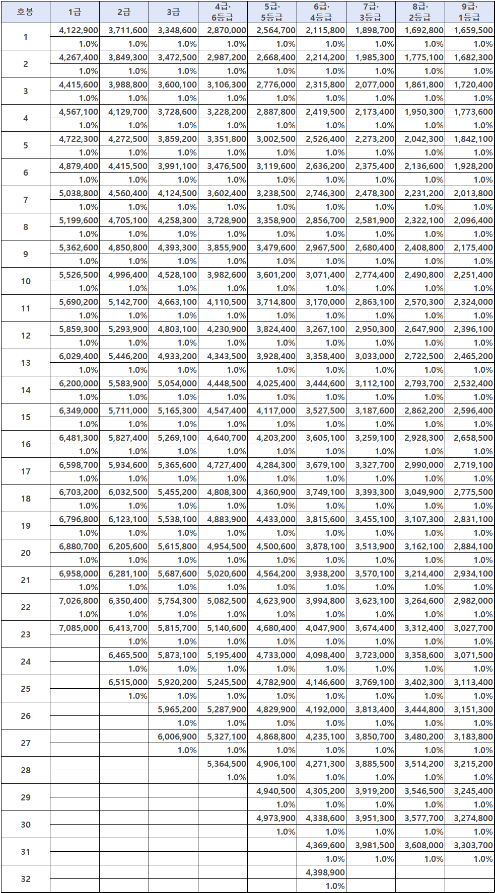 2023년 공무원 봉급표와 비교하기 위하여 2022년 공무원 봉급표도 준비하였습니다. 2022년에는 모든 급수 및 호봉의 봉급 인상률이 동일하게 1.6%였습니다.