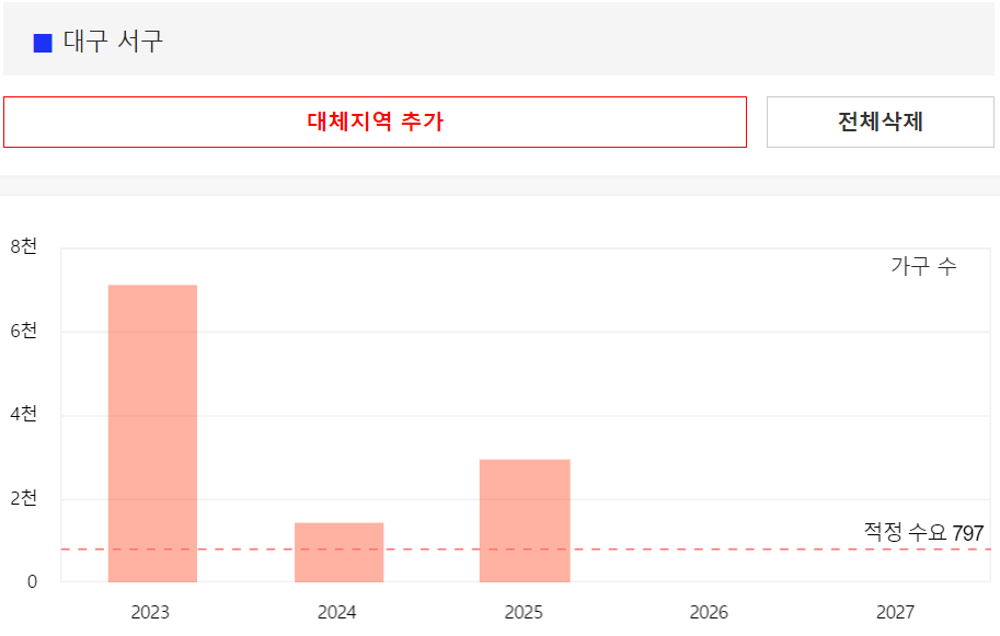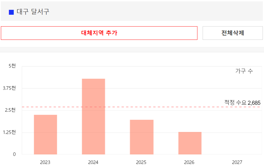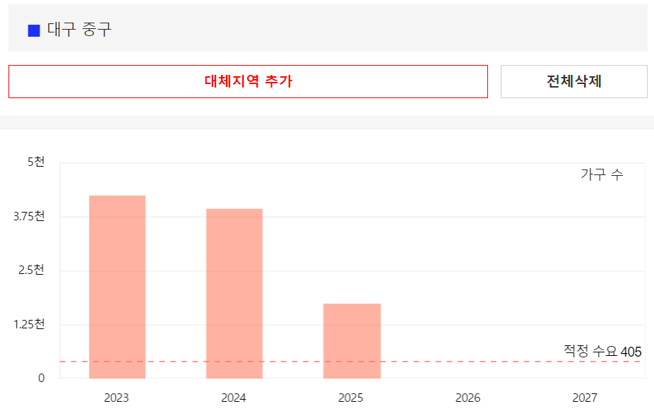 위의 그림에서 빨간점선은 대구에 필요한 적정 아파트 수량을 나타내며, 대구의 아파트 적정 수요는 매년 1만 2천세대 정도입니다. 하지만 23년에만 적정 수요의 3배에 육박하는 3만 4천세대가 입주할 예정이고, 24년에는 2만 1천세대 입주 예정, 25년에 들어서야 적정물량 미만인 1만세대정도로 줄어들게 됩니다.