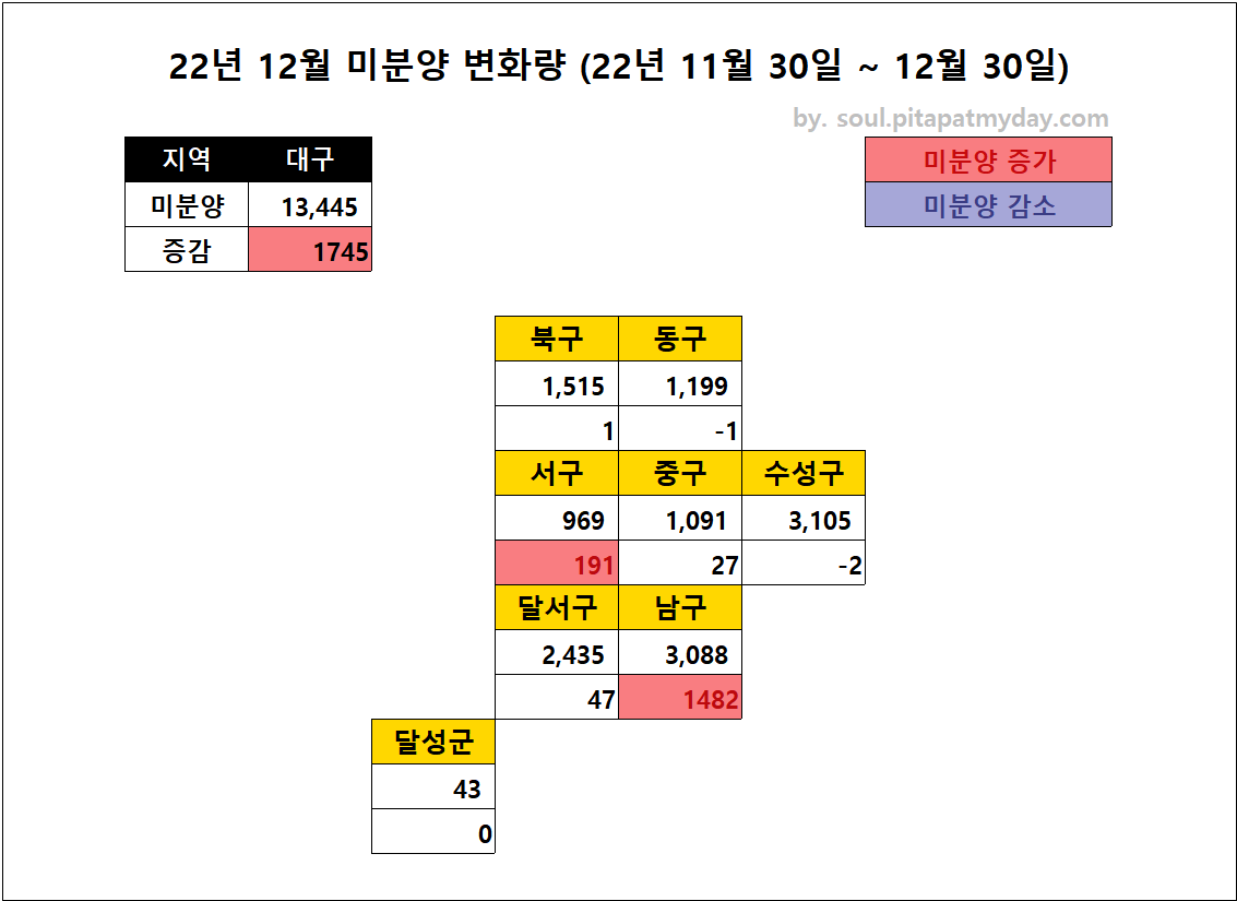 22년 12월 기준 전월 대비 대구 아파트 미분양 아파트 현황은 다음과 같습니다. 지난달 대비 1,745세대의 미분양이 증가를 하여 총 13,445세대의 미분양이 남아있습니다.